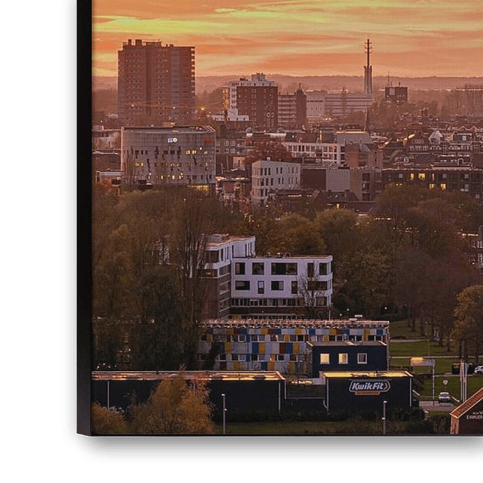Buy the photo Panorama and sunset of the Groningen skyline by Henk Meijer Photography on canvas, ArtFrame, poster and wallpaper, printed on demand in high quality.
