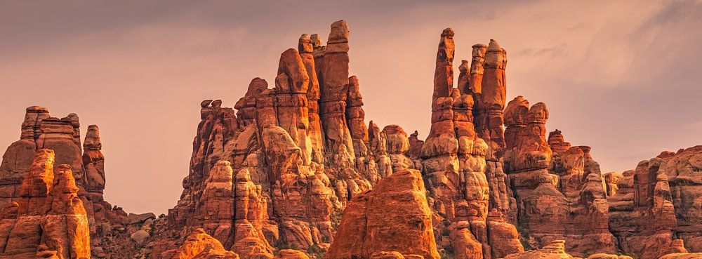 In this wide 65:24 XPan panorama, the sandstone peaks glow in warm shades of red, copper and gold, while the sky slowly fades to soft pastel colours.
