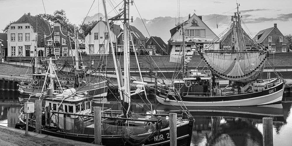 Buy the photo Panorama of Greetsiel harbour in Black and White by Henk Meijer Photography on canvas, ArtFrame, poster and wallpaper, printed on demand in high quality.