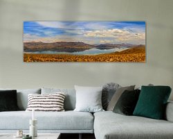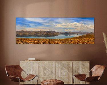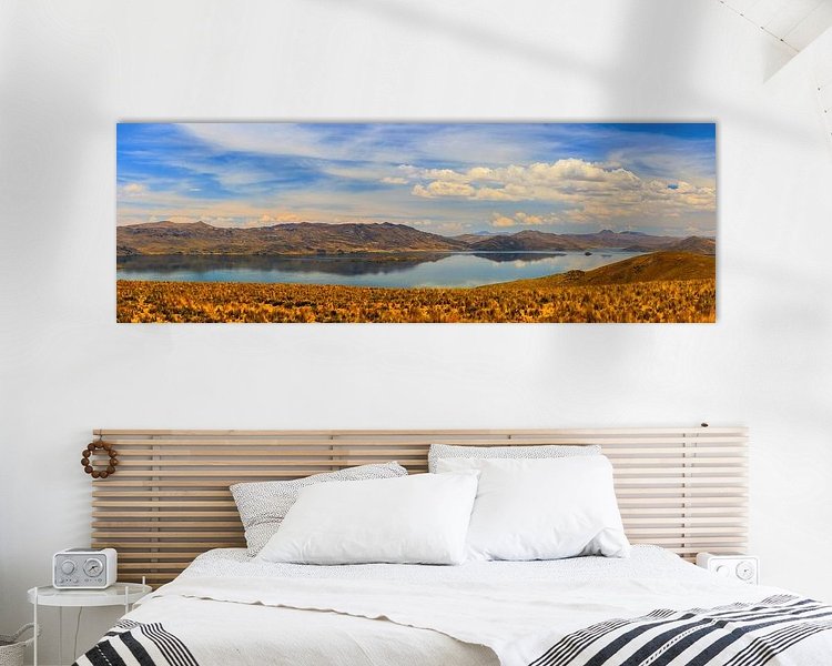 A wide 3:1 panoramic view of Lake Lagunillas, a lake in the Andes in extreme south-eastern Peru.