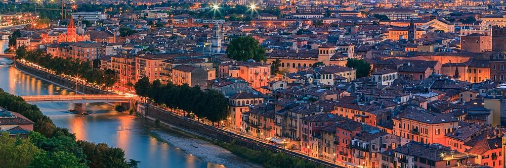 A wide 3:1 panoramic image of an evening in Verona as seen from Castel San Pietro.