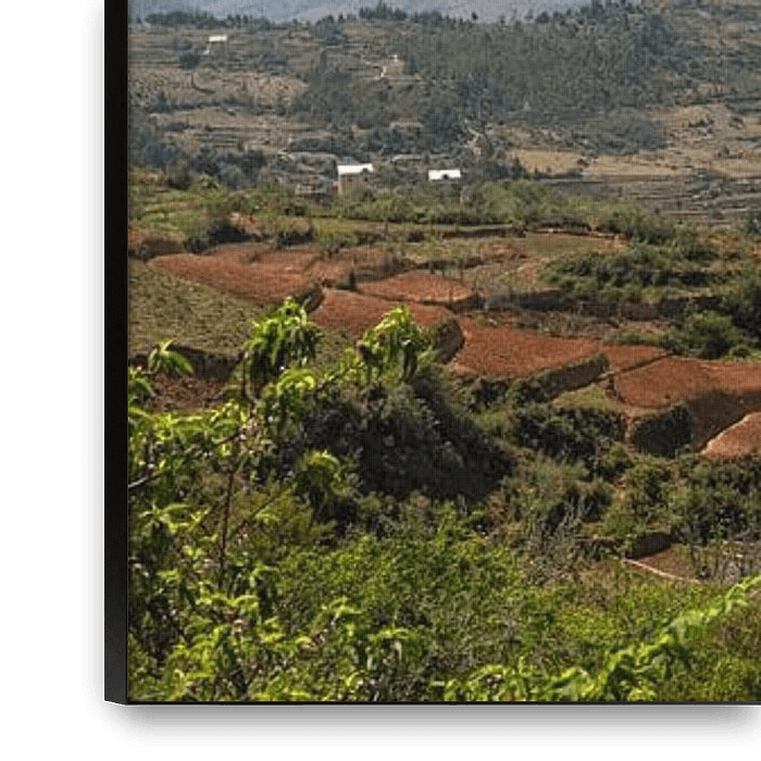 Panorama of the landscape between Ambositra and Ranomafana in Madagascar. In this part of Madagascar, you encounter a lot of terraced agriculture. This creates a contrasting image.