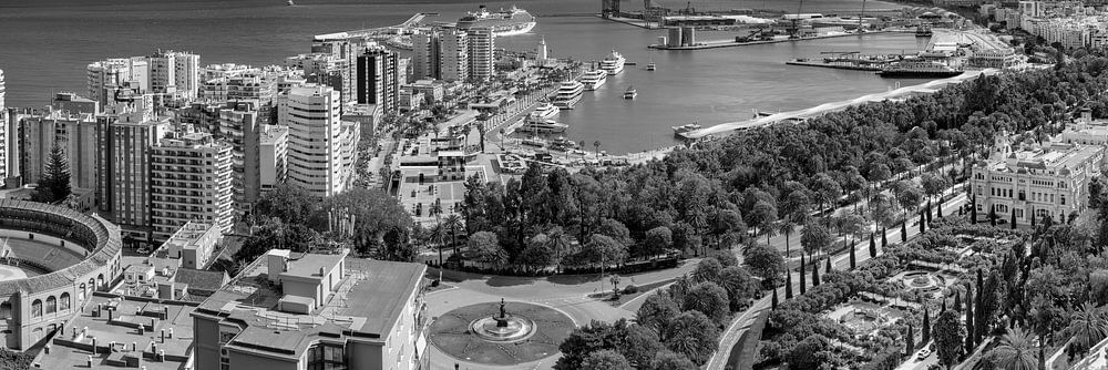 The city of Malaga on a glorious summer's day. Panorama of the beautiful city with its many sights such as the cathedral, the royal palace Alcazaba or the imposing Bull Camparena. Cityscape as a panoramic picture in black and white 90310336ays