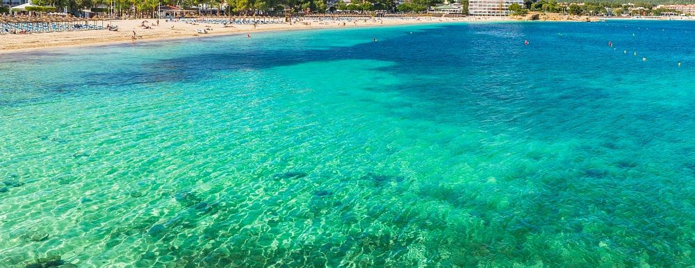 Panorama view of Platja de Palmanova on Mallorca island, Mediterranean Sea Spain, Mallorca, Balearic Islands, Balearic Sea, Mediterranean Sea, Spain