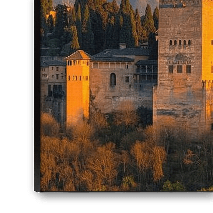 A wide panoramic view of the Alhambra, a palace located in the city of Granada, in the Andalusia region of southern Spain. The Alhambra is one of the most famous monuments of Islamic architecture and one of the best-preserved palaces of the historic Islamic world, alongside notable examples of Spanish Renaissance architecture.