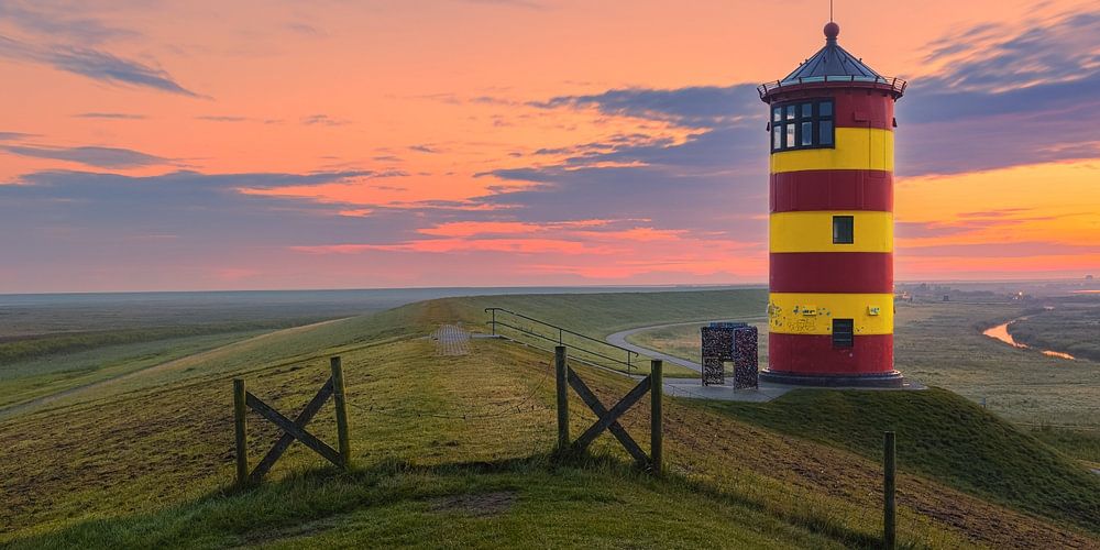 A 2:1 panorama image of a sunrise at the Pilsum lighthouse, located between Pilsum and Greetsiel on the North Sea dyke belonging to the municipality of Krummhörn in the north-west of the German state of Lower Saxony.