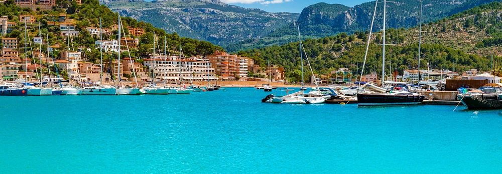 Panoramic seaside landscape view of yachts at bay of Port de Soller, Mallorca, Mediterranean Sea