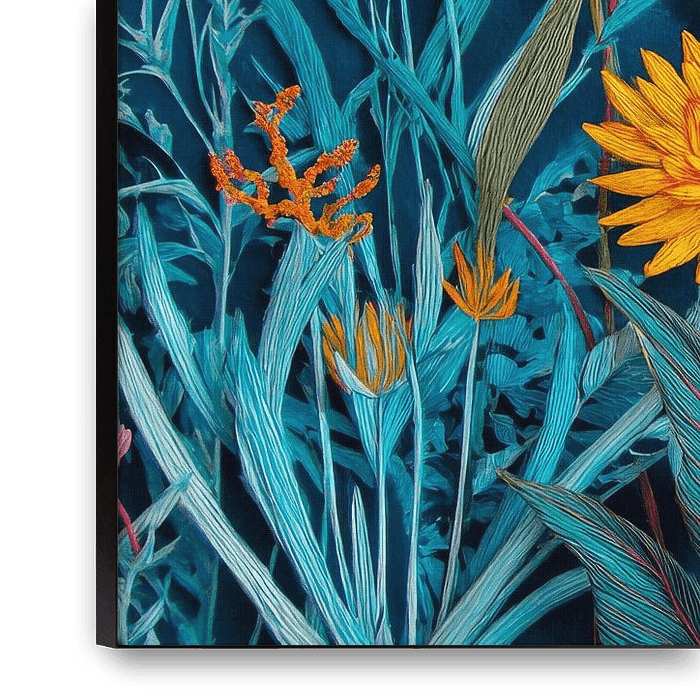 This vibrant botanical collage shows a colourful field of flowers and leaves, constructed entirely from carefully cut and folded paper. Yellow, pink, white and orange flower accents stand out against a deep blue background full of turquoise leaf textures. The rich textures and layering create a dynamic and playful image full of handmade…