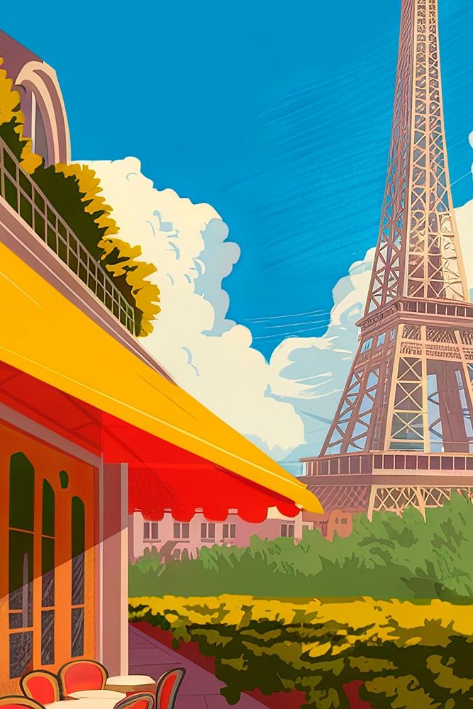 Inviting terrace chairs under the protective umbrella, with a view of the majestic silhouette of the Eiffel Tower, which rises proudly into the sky. The soft colours of the sky and the warm tones of the surroundings create an atmosphere full of romantic dreams and Mediterranean flair - the epitome of Paris, the city of love.