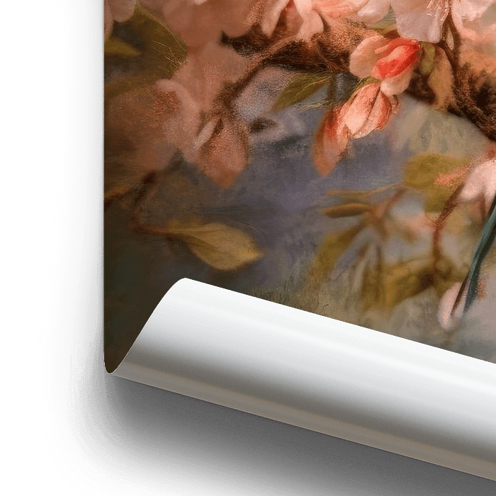 Two colorful parrots sit close together on a branch, surrounded by soft pink blossoms. Their vibrant colors and tender demeanor give this artwork a romantic and dreamy feel. Perfect for interiors that want to bring nature, love, and a touch of poetry into the home.