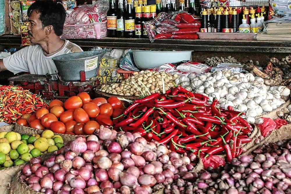 A visit to an Indonesian market is not to be missed. The exuberant colours, the delicious smells, the bustle and the chaos. A large part of the social life of the Indonesians takes place at the market every day. All kinds of spices, including peppers, limes, onions, spices, vegetables, meat, fish, etc. displayed and for sale including haggling at a market in Singaraja, North Bali