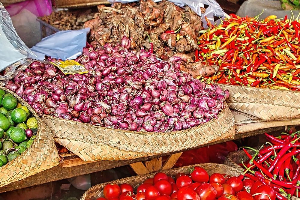 A visit to an Indonesian market is not to be missed. The exuberant colours, the delicious smells, the bustle and the chaos. A large part of the social life of the Indonesians takes place at the market every day. All kinds of spices, including peppers, limes, onions, spices, vegetables, meat, fish, etc. displayed and for sale including haggling at a market in Singaraja, North Bali
