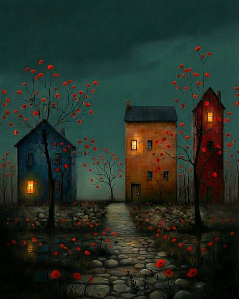 Three houses stand in twilight’s grace, No soul reveals a human face. Yet amber windows softly burn, For those who leave, and act in turn.
