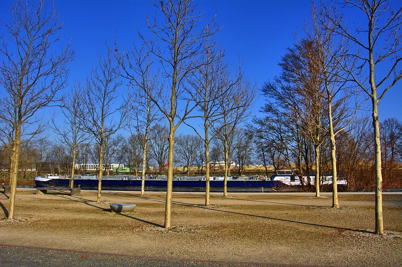 View through trees on a canal ship on the Rhine-Herne Canal in Gelsenkirchen. The impression is created that a ship is sailing through the forest.