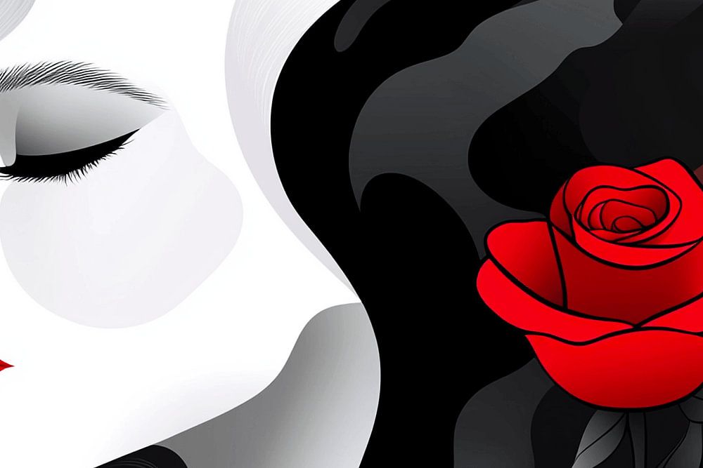 The profile of a woman, depicted in a clean black and white style, is subtly accentuated by a deep red rose next to her face. The rose symbolises love, passion and impermanence, while the contrasting colour tones create a classic and timeless look. The minimalist composition emphasises the woman's natural beauty and invites the viewer to dwell on the quiet power of the image.
