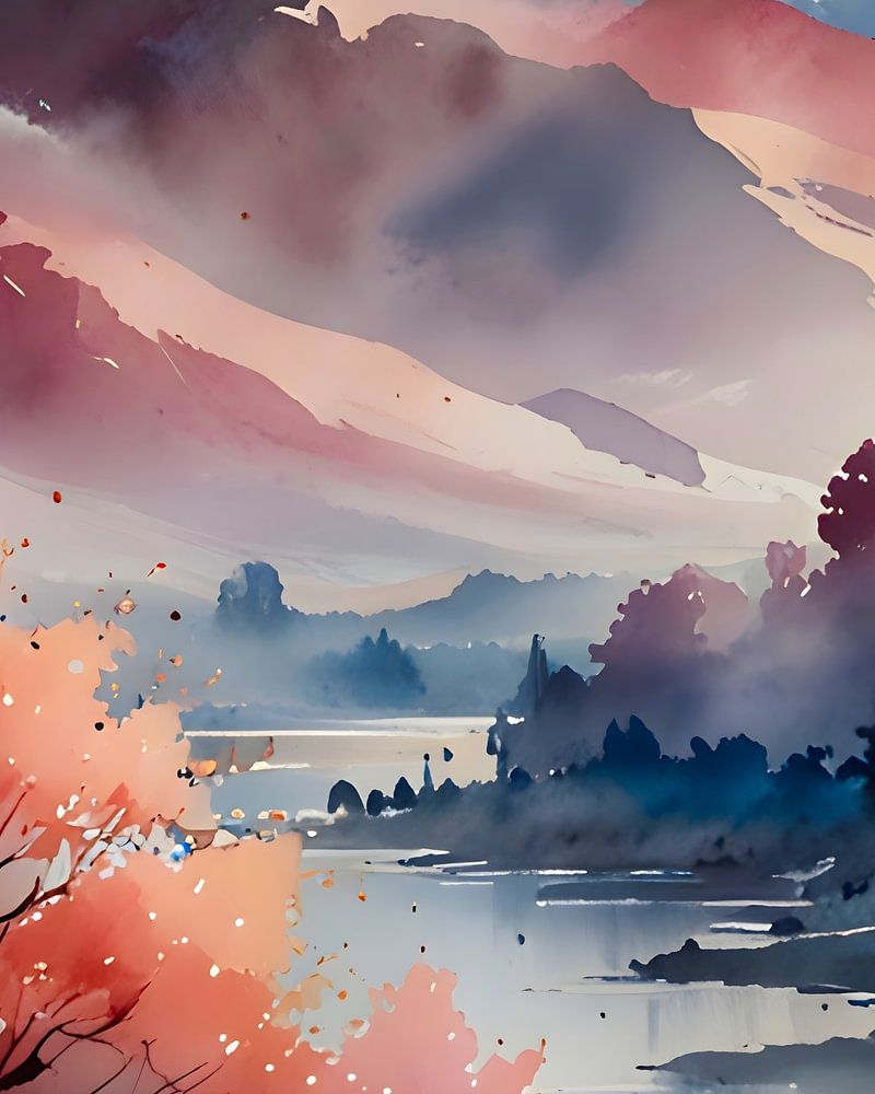 Buy this landscape artwork Pastel Peaks and Calm Waters by Kintsugi99 on canvas, ArtFrame, poster and wallpaper, printed on demand in high quality.