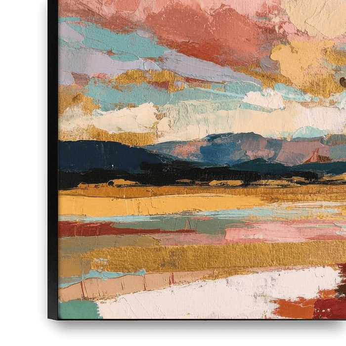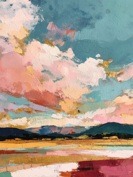 This contemporary abstract landscape artwork captures the atmosphere of an expansive horizon under a softly layered sky. Broad, expressive brushstrokes blend pastel pinks, warm peach, muted turquoise, and soft blues, creating a dynamic yet harmonious composition. Hints of gold and earthy tones add depth and subtle contrast, while darker…