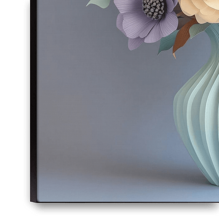 This artwork shows a delicate rendering of paper flowers in a vase, painted in soft pastel tones that evoke a serene and sophisticated atmosphere. The flowers, carefully rendered with soft lines and subtle texture, almost seem to breathe, despite their paper nature. The soft colours, from light shades of blue to pink and lavender,…