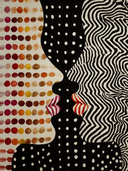 Pattern Kiss is a striking pop art piece full of graphic patterns and colour. In the centre, you see two stylised profiles that almost kiss each other: one side composed of colourful dots in red, pink, orange and ochre, the other of black and white zebra lines. The black silhouettes with white polka dots create a strong contrast and…