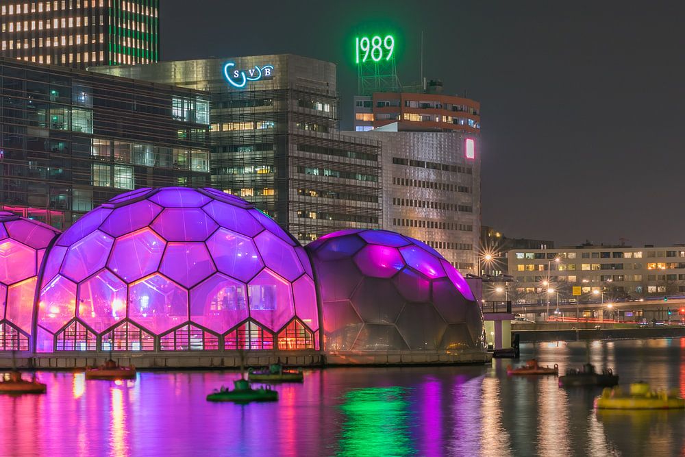 View of the floating pavilion in the Rotterdam Rijnhaven with its characteristic, colorfully illuminated floating bulbs