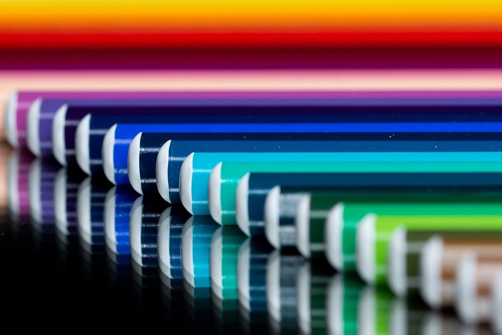 All colored pencils in rainbow colors in a row. The photos are unique because in each photo the focus point is a little further and further away. In the first picture the focus is in front and in the last picture it is at the back