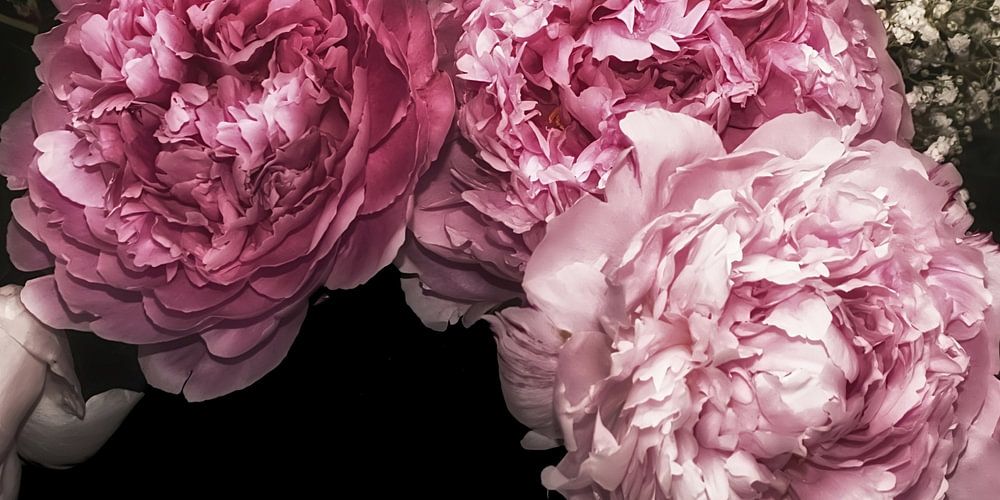 These peonies line up elegantly and look as if they were made of silk, so soft and smooth are their petals. In soft pink shades, they line up tone on tone and radiate elegance and beauty. You can see their delicate structure and the multitude of petals that a single flower bears.