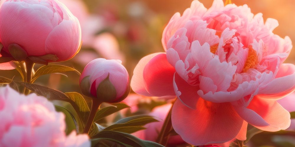 In the warmth of the late afternoon sun, a field of peonies stretches to the distant horizon. A rainbow of colours is bathed in the glowing light. The sky is filled with fiery orange, deep red and soft purple while the earth below is covered with peonies in shades of bright pink, soft white and deep red.