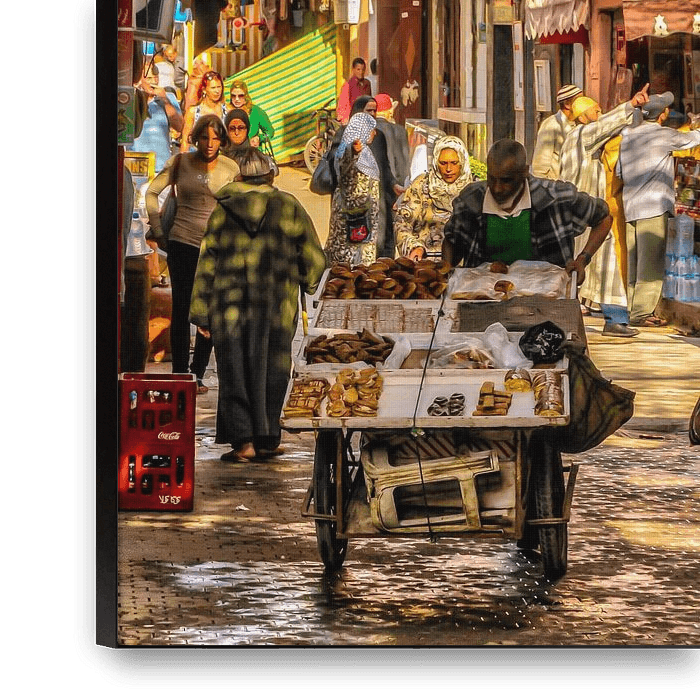 Buy the photo People in colorful alley in the medina of Marrakech in Morocco by Dieter Walther on canvas, ArtFrame, poster and wallpaper, printed on demand in high quality.