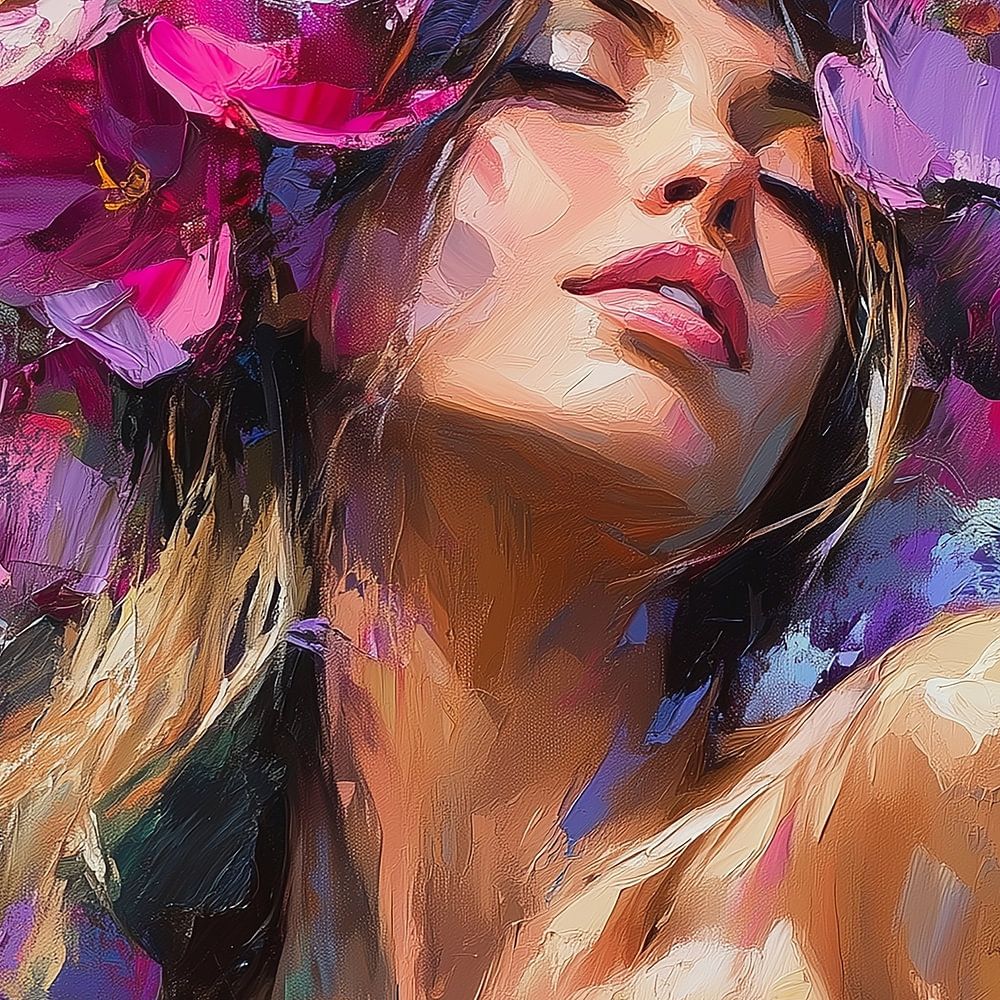 An oil painting of flowers, executed in the Impressionist style with visible brushstrokes that capture the dynamism and vibrancy of the subject. In the painting, we see a beautiful woman whose hair and parts of her face are covered with colourful petals and green leaves. These floral elements create a harmonious connection between the woman and nature, making her seem almost one with her surroundings. The vibrant colours and playful composition evoke a sense of joy and energy, and the use of impressionist techniques adds a dreamy quality to the whole, celebrating the beauty and fragility of nature in a unique way.