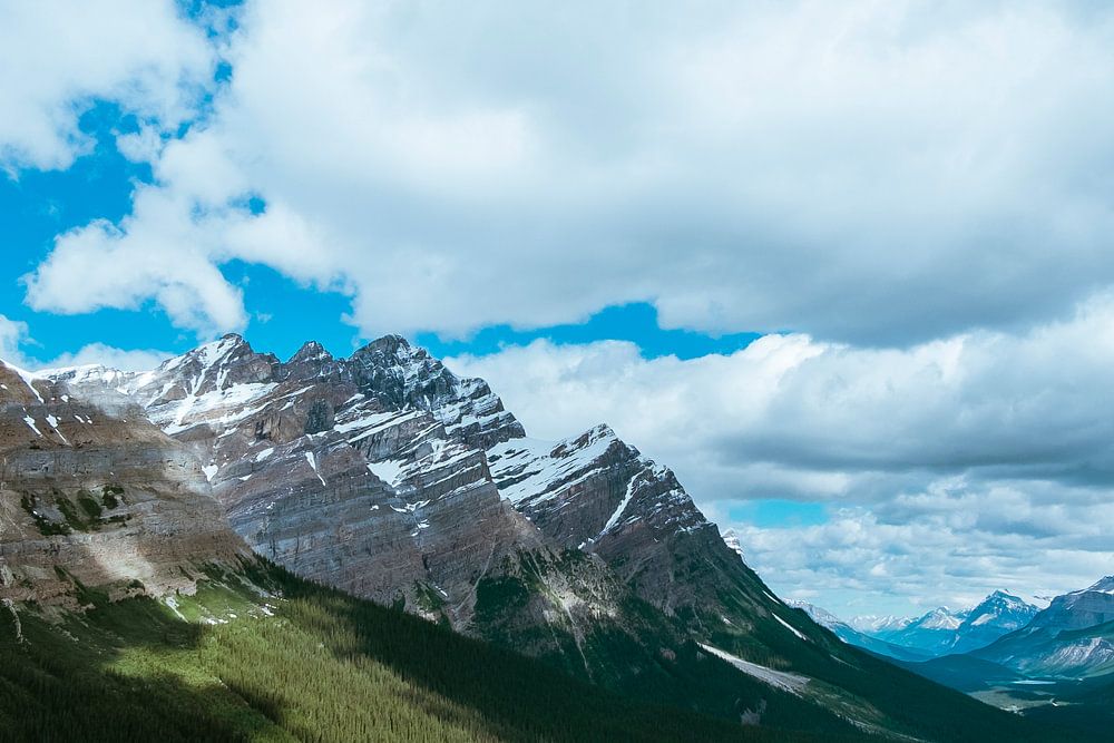 This is Peyto Lake, located in the Canadian Rockies. This lake is known for its unique shape, can you spot the fox? This photo was taken in summer, but you can still see the snow on the mountain tops! This is also because there are many glaciers nearby. The water in the lake comes from these glaciers making it a unique shade of blue.
