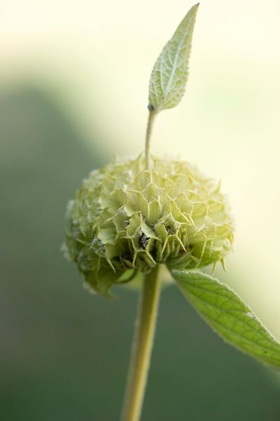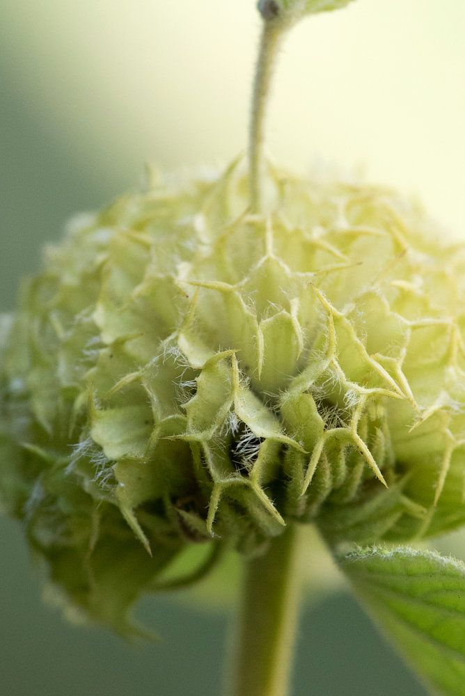 The upper flower of the Phlomis, finished flowering and with the first nuts visible in the green. The leaves at the top of the composite flower give a cheerful effect.