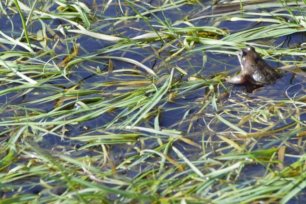 At first sight the photo shows grass and water, but if you look closely you see a frog. The legs are clearly visible under water and his head is looking out of the water.