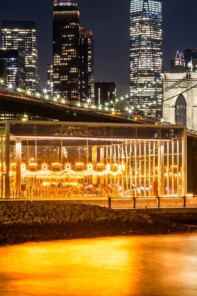 Captivating view of the illuminated skyline of Lower Manhattan and the Brooklyn Bridge at night from Pebble Beach, a charming little waterfront promenade. The twinkling lights of the bridge and skyscrapers are gently reflected on the surface of the East River, creating a magical atmosphere. In the foreground you can enjoy Jane’s Carousel, a historic carousel from 1922 in a glass pavilion. This nocturnal view of New York City combines modernity and history: the Brooklyn Bridge, a symbol of 19th century engineering, meets the ultra-modern architecture of Manhattan.