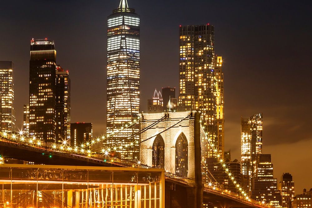 Captivating view of the illuminated skyline of Lower Manhattan and the Brooklyn Bridge at night from Pebble Beach, a charming little waterfront promenade. The twinkling lights of the bridge and skyscrapers are gently reflected on the surface of the East River, creating a magical atmosphere. In the foreground you can enjoy Jane’s Carousel, a historic carousel from 1922 in a glass pavilion. This nocturnal view of New York City combines modernity and history: the Brooklyn Bridge, a symbol of 19th century engineering, meets the ultra-modern architecture of Manhattan.