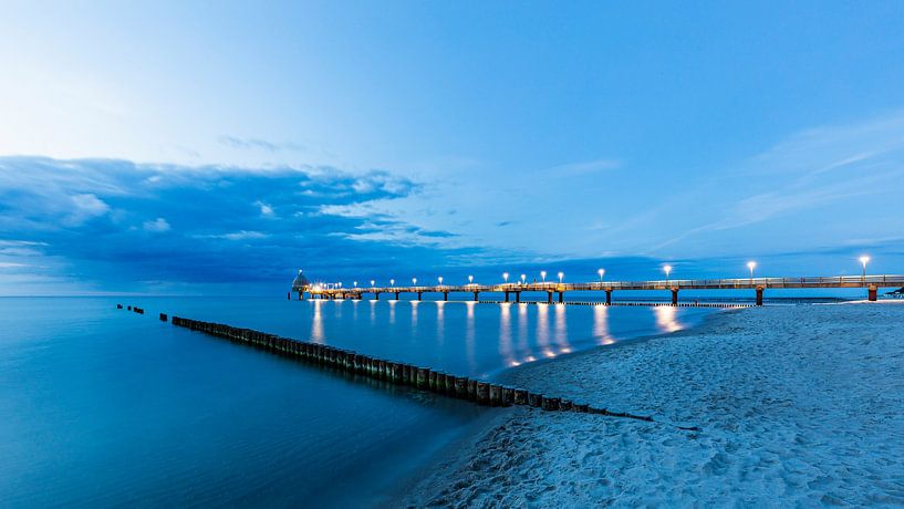 Pier with the diving gondola and the beach in the Baltic seaside resort of Zingst on the Baltic Sea at dusk, Fischland-Darß-Zingst, Mecklenburg-Western Pomerania, Germany