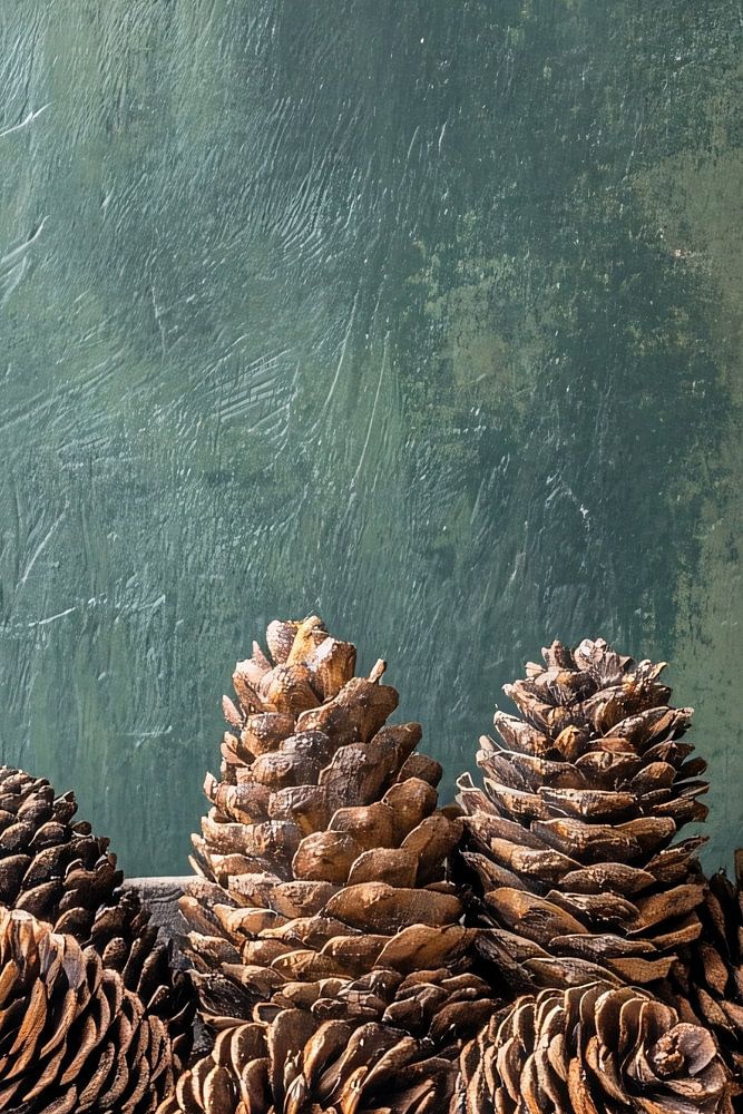 A rustic and atmospheric design featuring a weathered wooden bowl filled with a collection of natural pine cones. The background has a soft, matte green hue, giving it a warm and calming look. Perfect as decoration in minimalist or Japandi-inspired interiors. This design exudes simplicity and natural beauty and fits perfectly in a variety of spaces, such as a living room, hall or even an office space. Ideal for those who love an understated yet atmospheric style.
