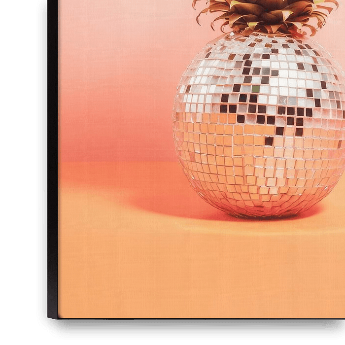 On a soft background of delicate peach fuzz, a pineapple shines in all its disco-sparkling splendour. The fruit, usually associated with tropical atmospheres, is catapulted into a new dimension here as it finds itself in the midst of the 70s retro era.
