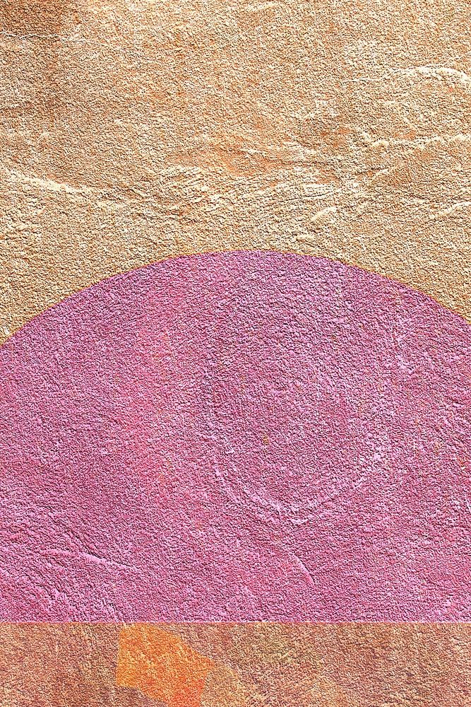 Abstract art with a coarse texture on stone in lilac,pink,orange,copper and brown tones with a large pink semicircle. fantasy mixed media.