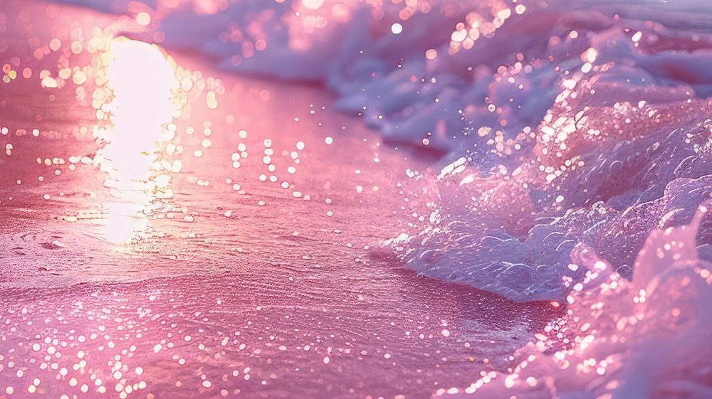 The image is imbued with a deep, soothing serenity, but also a dynamic energy due to the gently breaking foam of the waves on the beach. The sun seems to sink just behind a distant land mass, spreading a warm glow throughout the scene. The water reflects the light in a spectrum of pink and orange hues, creating a magical, almost unreal effect. The details of the foaming waves and wet grains of sand are captured with exceptional clarity, making every aspect of this moment shimmer and sparkle.