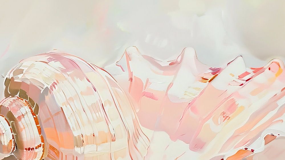 The shell combines smooth curves and sharp edges, which have been expertly highlighted with refined brushstrokes in warm shades of pink, cream and white. The use of colour and light evoke a sense of timelessness and serenity. The background, consisting of abstract sweeping patterns, enhances the focus on the shell without being distracting. The shadow under the shell adds a subtle sense of depth to the composition.