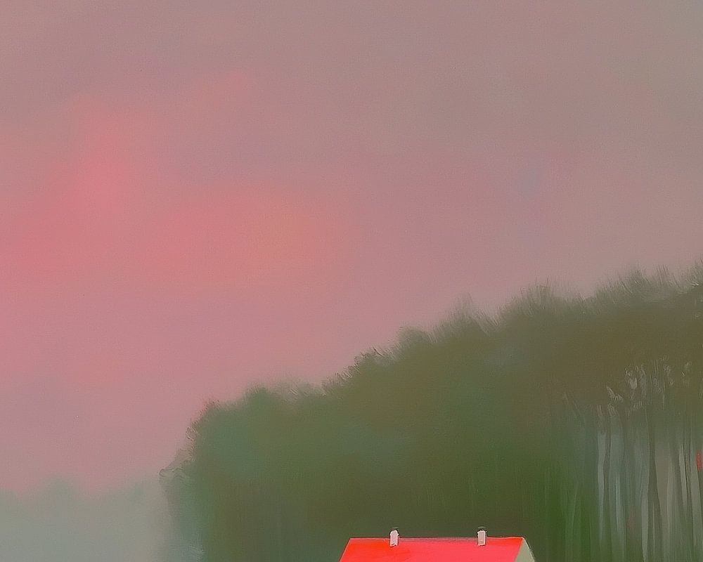 Roze hemel - Het schilderij opent als een ademhaling: een brede, zachte roze hemel die het grootste deel van het vlak beslaat en alles onder zich in een warm, gedempt licht hult. Die roze lucht — bijna fluisterend, soms koraal — domineert de beleving en zet meteen de toon. In dat zee van kleuren verschijnt een klein, helder element dat…