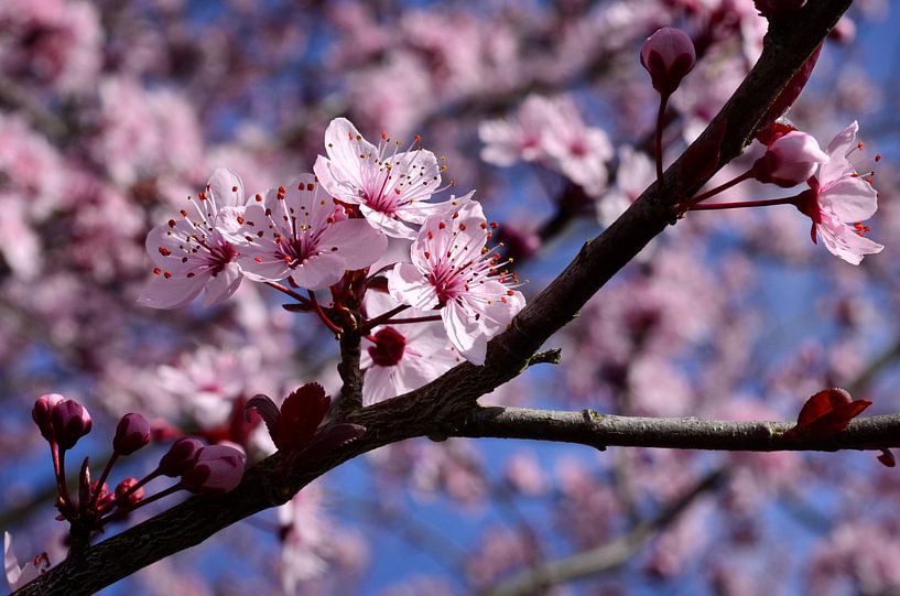 A photograph of a branch with pink blossoms in early spring. This is one of the first trees to bloom in a small park near where I live. The pink flowers stand out beautifully against the blue sky.