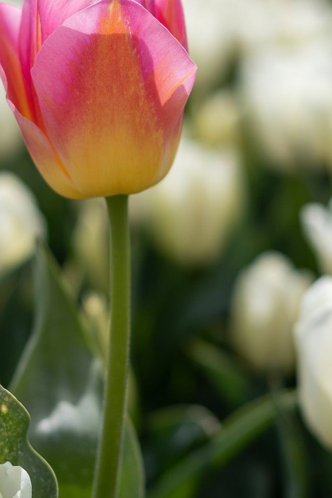 A pink/yellow tulip in a field of white tulips. The tulip stands out well above the other tulips. You can see the green stems. Tulips from Goeree Overflakkee