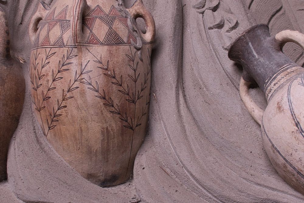 While visiting a sand sculpture exhibition, I saw these 3 jars woven into the sand. They actually belong to a larger whole but I cut them out so that a more compact image resulted. This way it doesn't distract from the whole. No bright colours which gives more tranquillity and an Oriental touch to it.