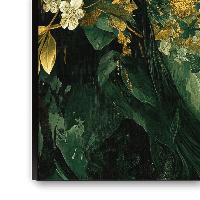 Details: botanical painting, female face, green plants, golden flowers, nature art, face painting, floral portrait, organic, artistic, environmental art