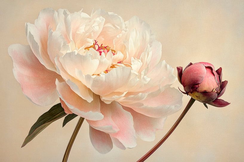 A gentle touch of elegance, captured in delicate shades of pink, the majestic peony shines next to its dainty offspring. The attention to detail of the petals and the subtle colour nuances convey an atmosphere of calm and beauty. Perfect for the bedroom to create a peaceful and romantic mood.