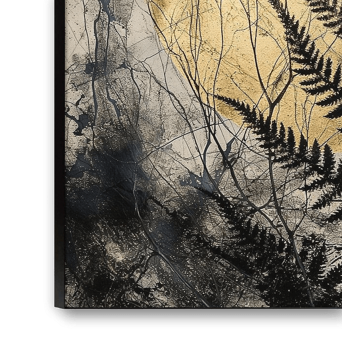 Image of prints of a fern and other delicate plants against a beige background topped by a white moon a golden sun. Somewhat abstract and surrealistic. Fits various styles and trends, including botanical, summer, minimalist, understated. Artist: Bianca ter Riet