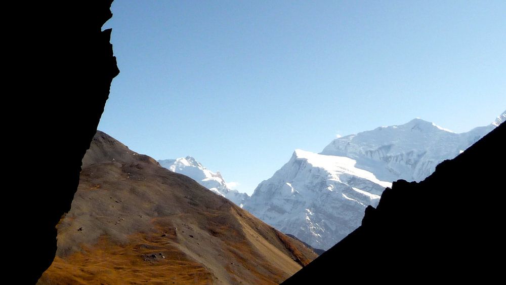 Een doorkijkje tussen bergen naar sneeuwtoppen van het Annapurna gebergte in de Himalaya, Nepal