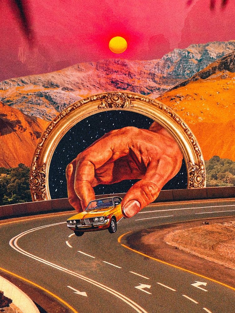 Play Time is a bold and playful artwork blending surrealism, fantasy, and retro aesthetics. A giant hand emerges from a cosmic portal in the mountains, gently guiding a car as it navigates a curving road. Set against a backdrop of fiery orange skies and rugged terrain, this composition is both whimsical and thought-provoking, evoking themes of fate, control, and the mysteries of the universe.