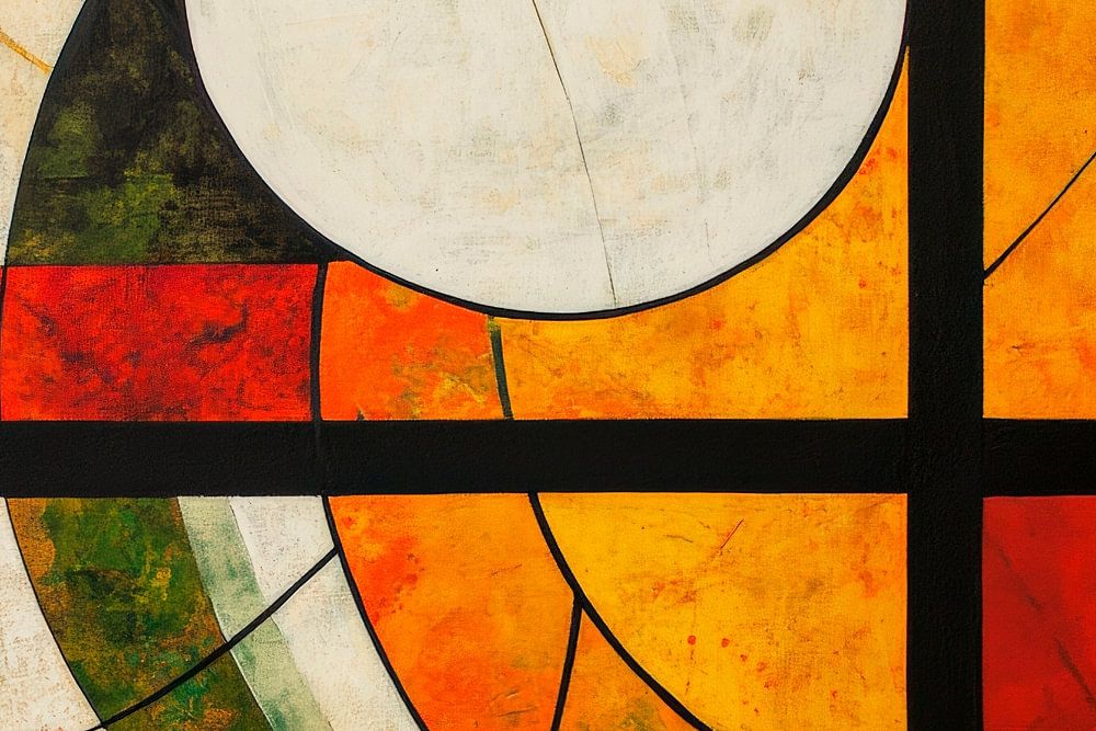 Vibrant colours and harmonious geometric shapes dance on the canvas, while warm tones of orange and red are contrasted by cooler shades of green. This dynamic composition evokes an atmosphere of creative energy and is perfect for a modern office where inspiration and clarity are encouraged.